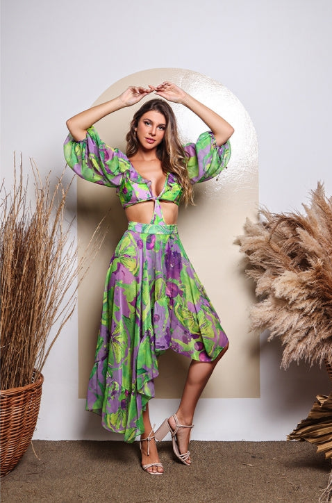 Embrace the essence of tropical sophistication with our Açaí print skirt. The design showcases a graceful ruffle detail along the hemline, adding a touch of playful charm. The fabric, imbued with a subtle translucence, lends an air of understated luxury, making it an exquisite addition to your beach wardrobe.
