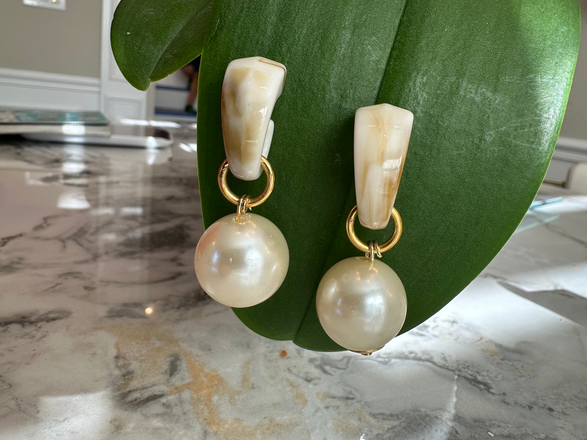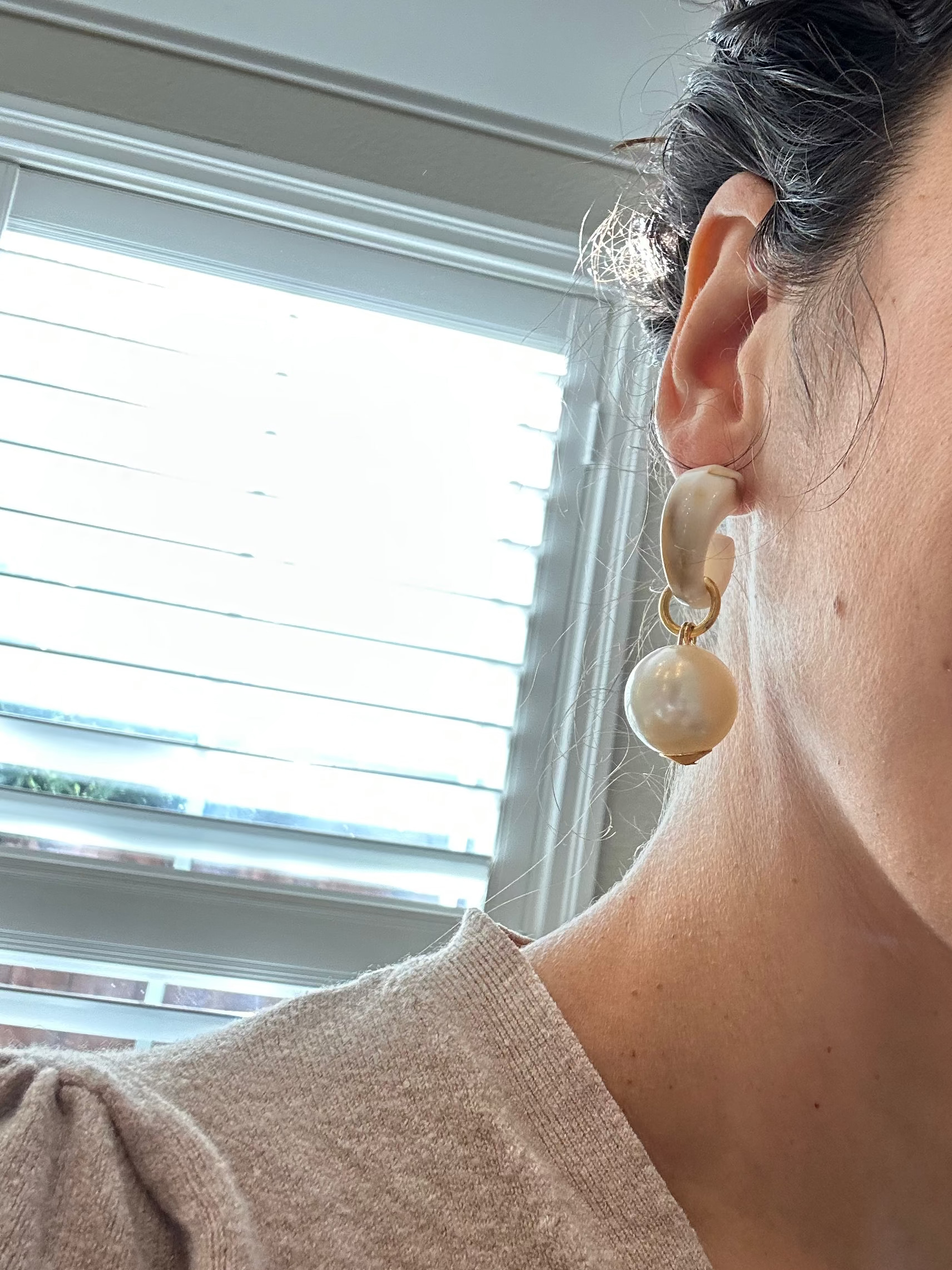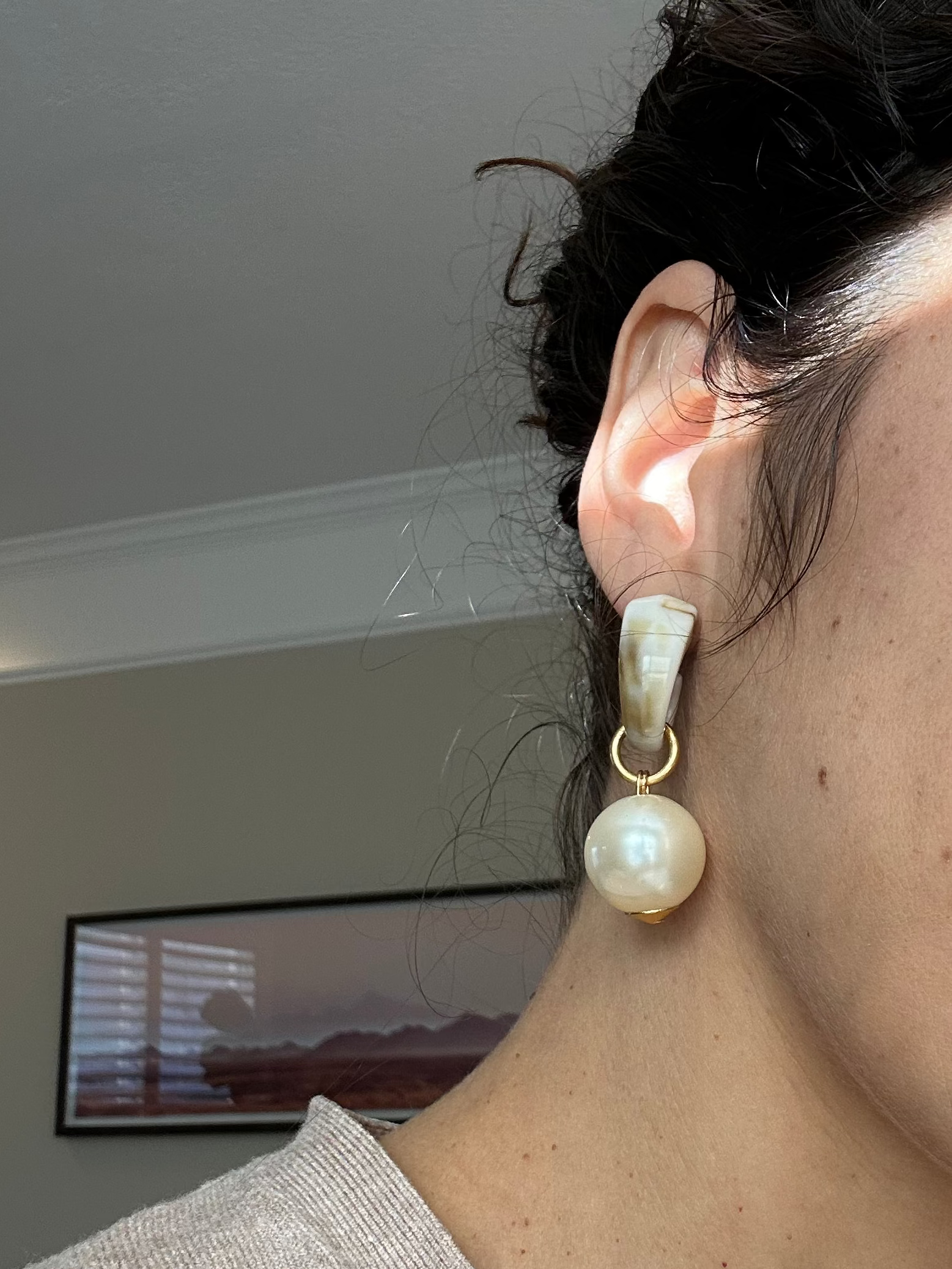 Soft tones, natural vibes. The Marble Drop Hoops blend creamy resin with a single luminous pearl — a mix of texture and glow that feels effortlessly chic. Wear them when you want your look to whisper elegance with a twist.