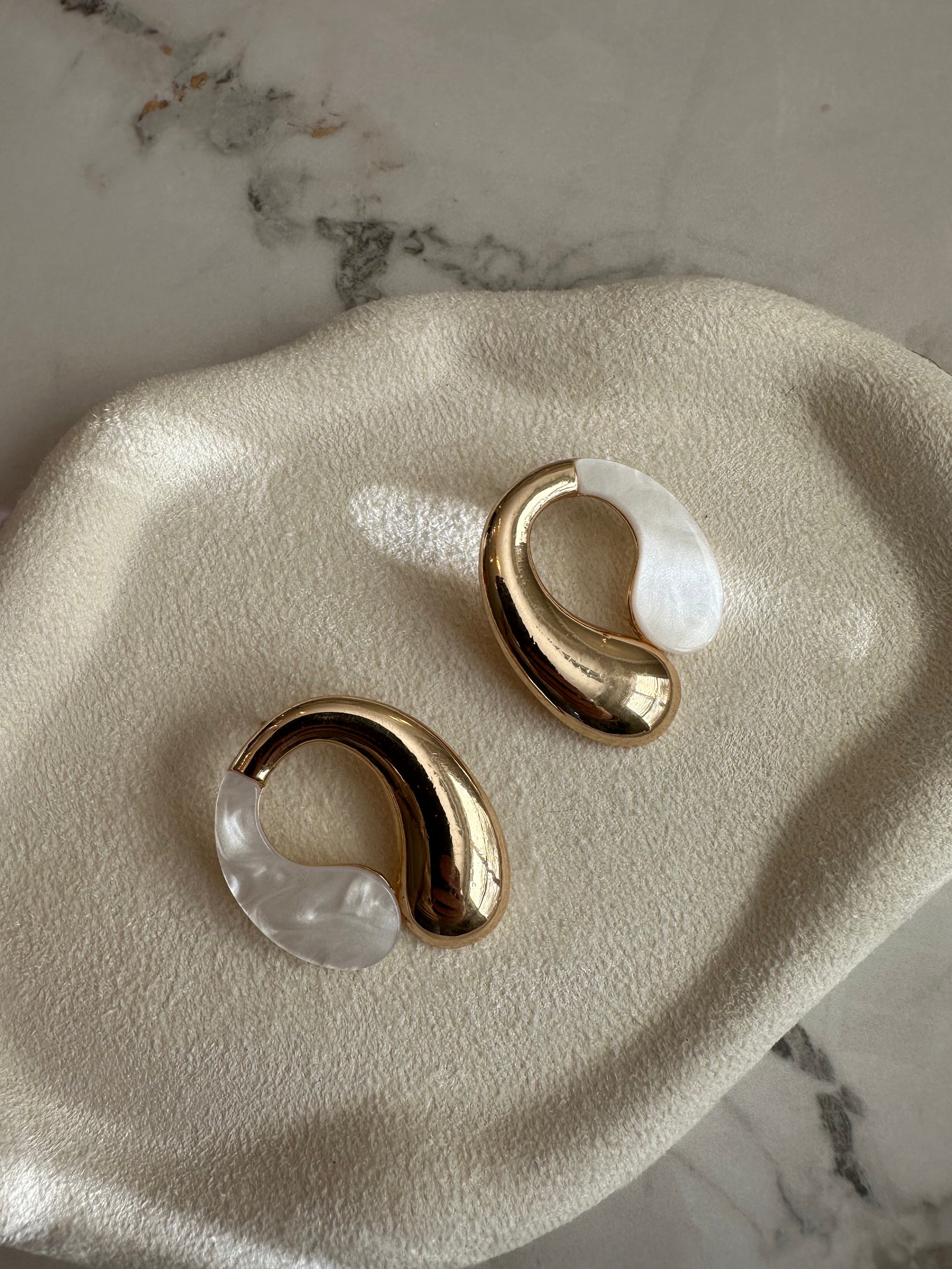These organic-shaped studs blend a soft pearlescent finish with polished gold — a play of light and texture that feels both modern and timeless. Elegant yet bold, they’re the kind of piece that turns harmony into statement.