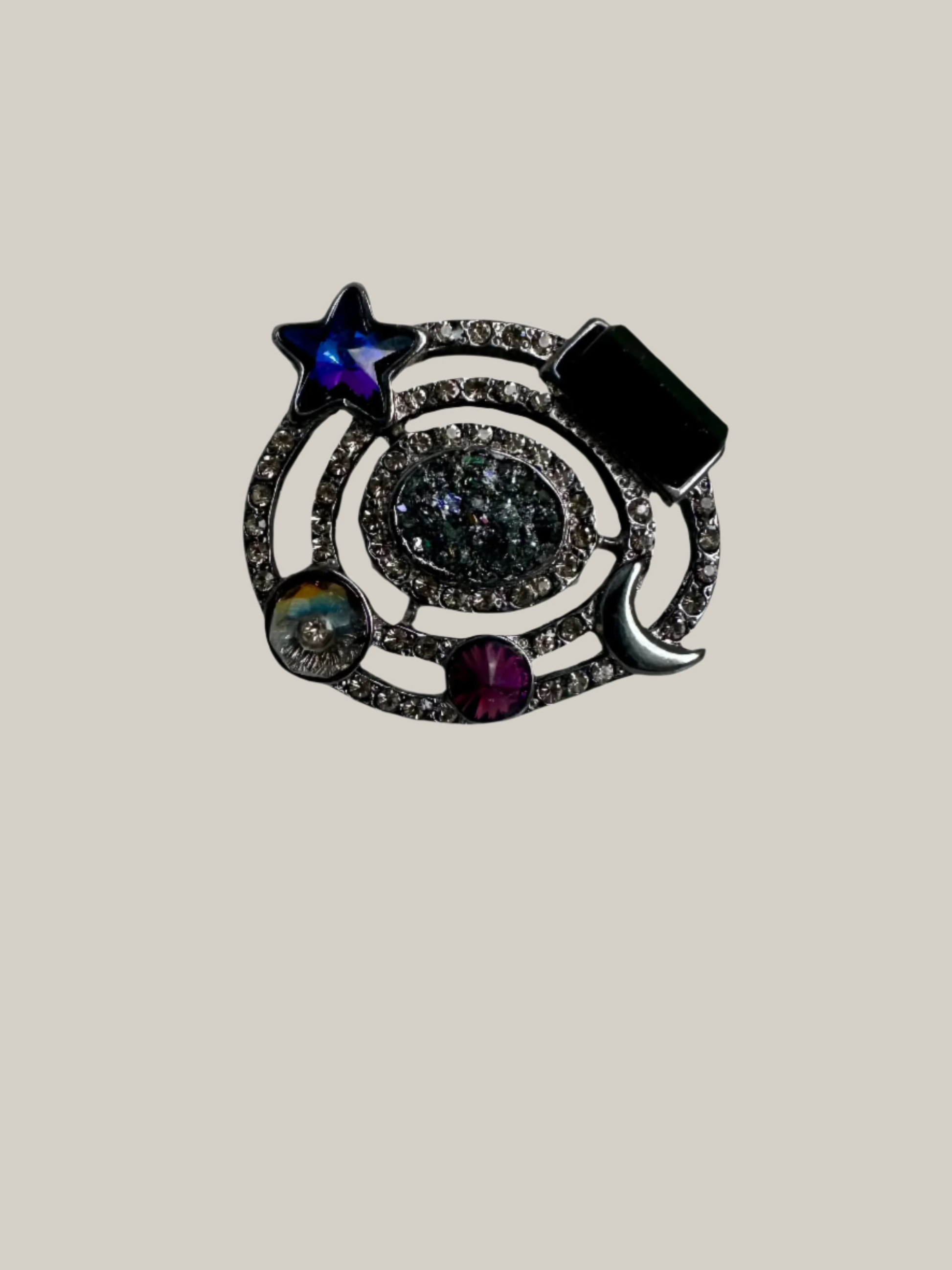 This piece features colorful Swarovski crystal stones and is inspired by galaxies.