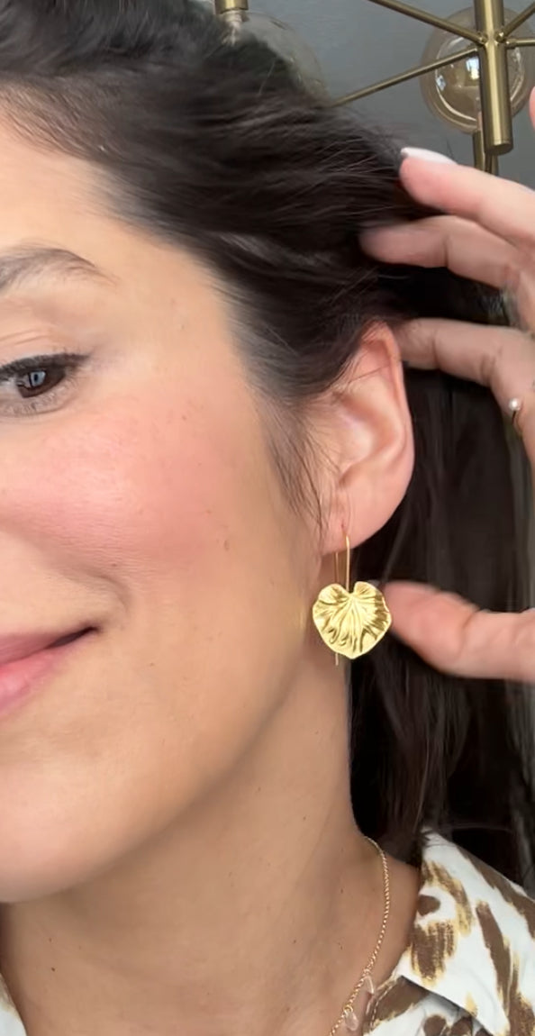 Golden leaf threader earrings designed with graceful movement and a sculptural silhouette. Lightweight and refined, they slide effortlessly through the ear, creating an elongated, modern look — elegant, nature-inspired, and quietly striking.