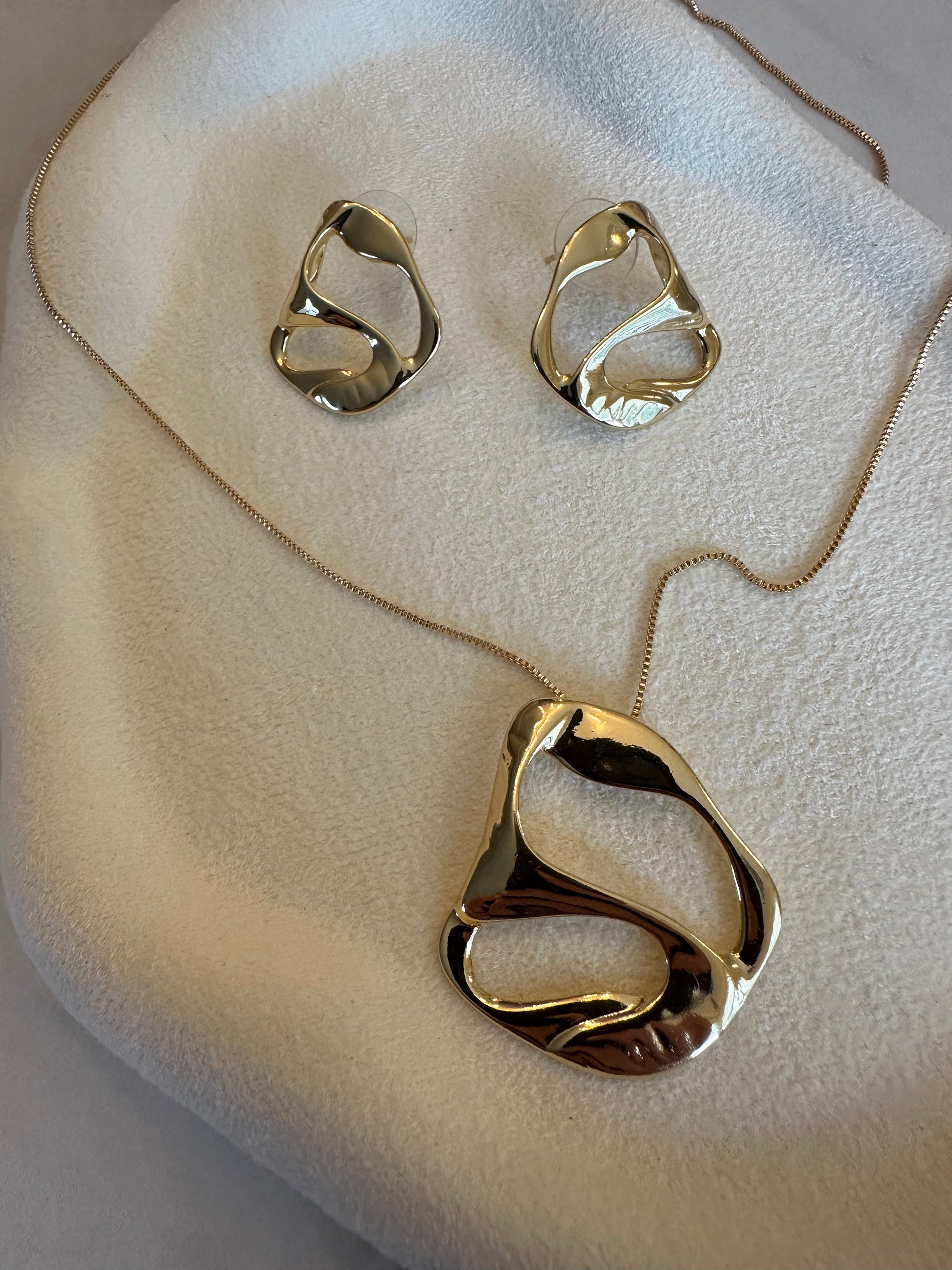 A golden jewelry set that celebrates fluid form and balance. The Harmonia Set features an organic-shaped pendant necklace paired with matching studs — pieces that flow together effortlessly. Elegant, modern, and timelessly refined.