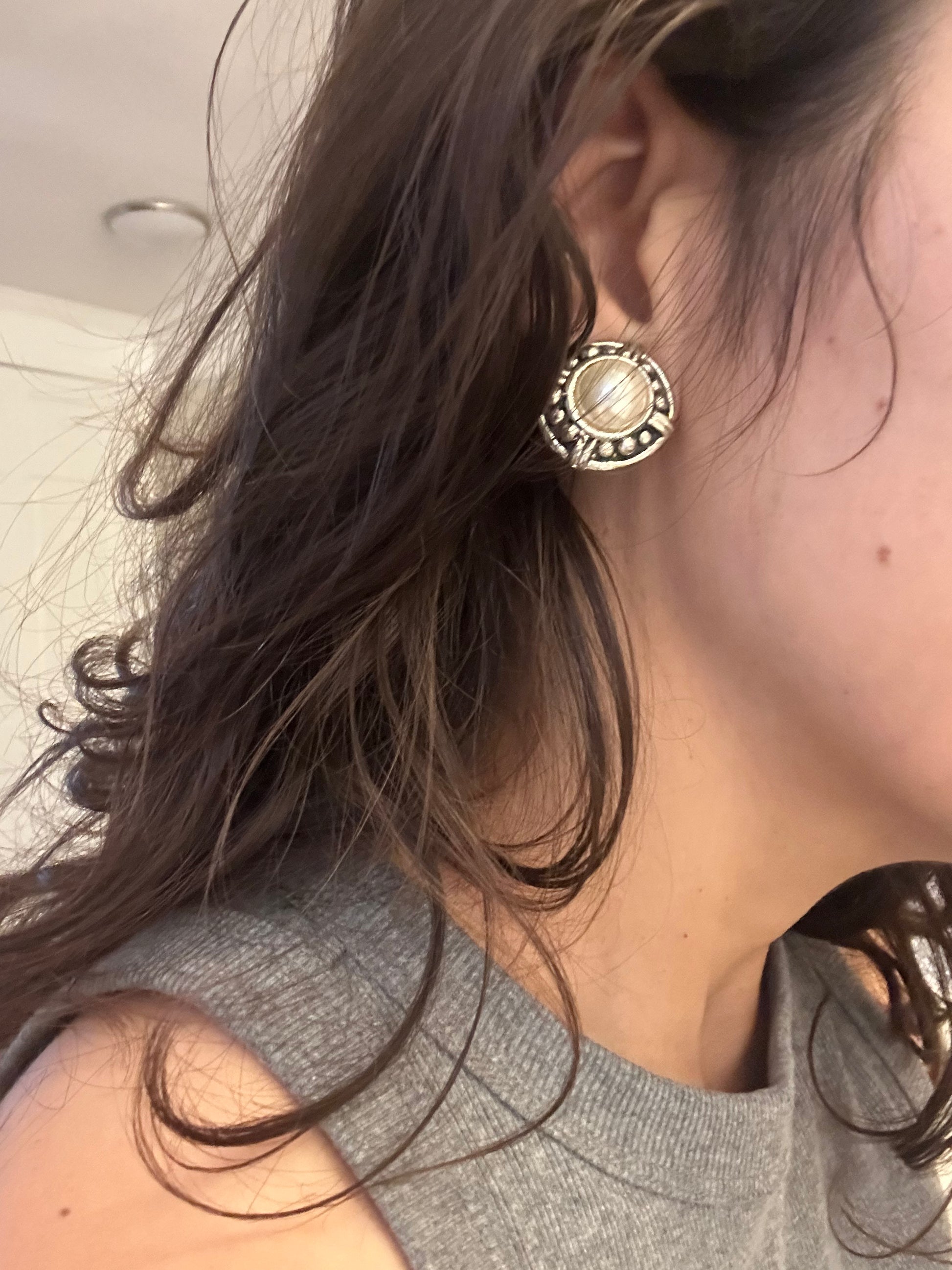 Vintage silver studs featuring a luminous pearl at the center. Elegant and timeless, they bring a soft glow and refined touch to any look — a delicate piece that never goes out of style.