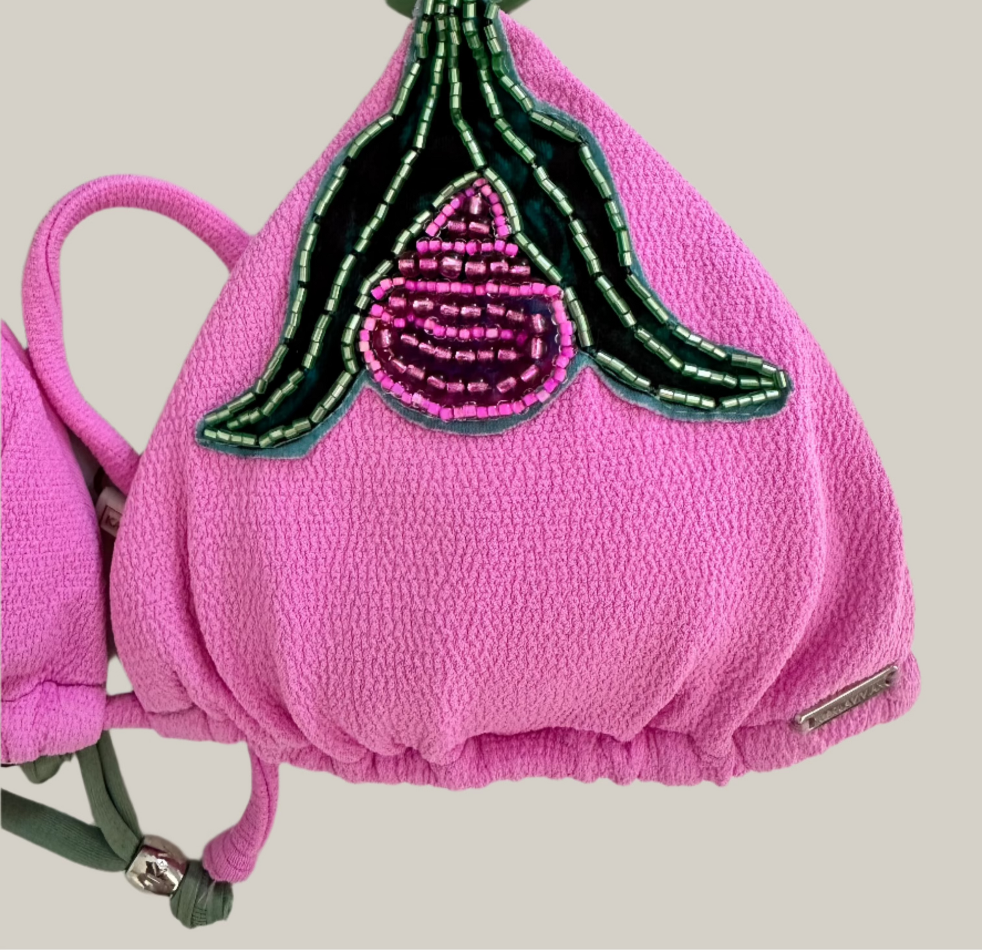 Triangle bikini with exclusive embroidery design, featuring a ring detail and double green straps. Its unique style adds a touch of sophistication to the classic triangle model. Includes removable padding.